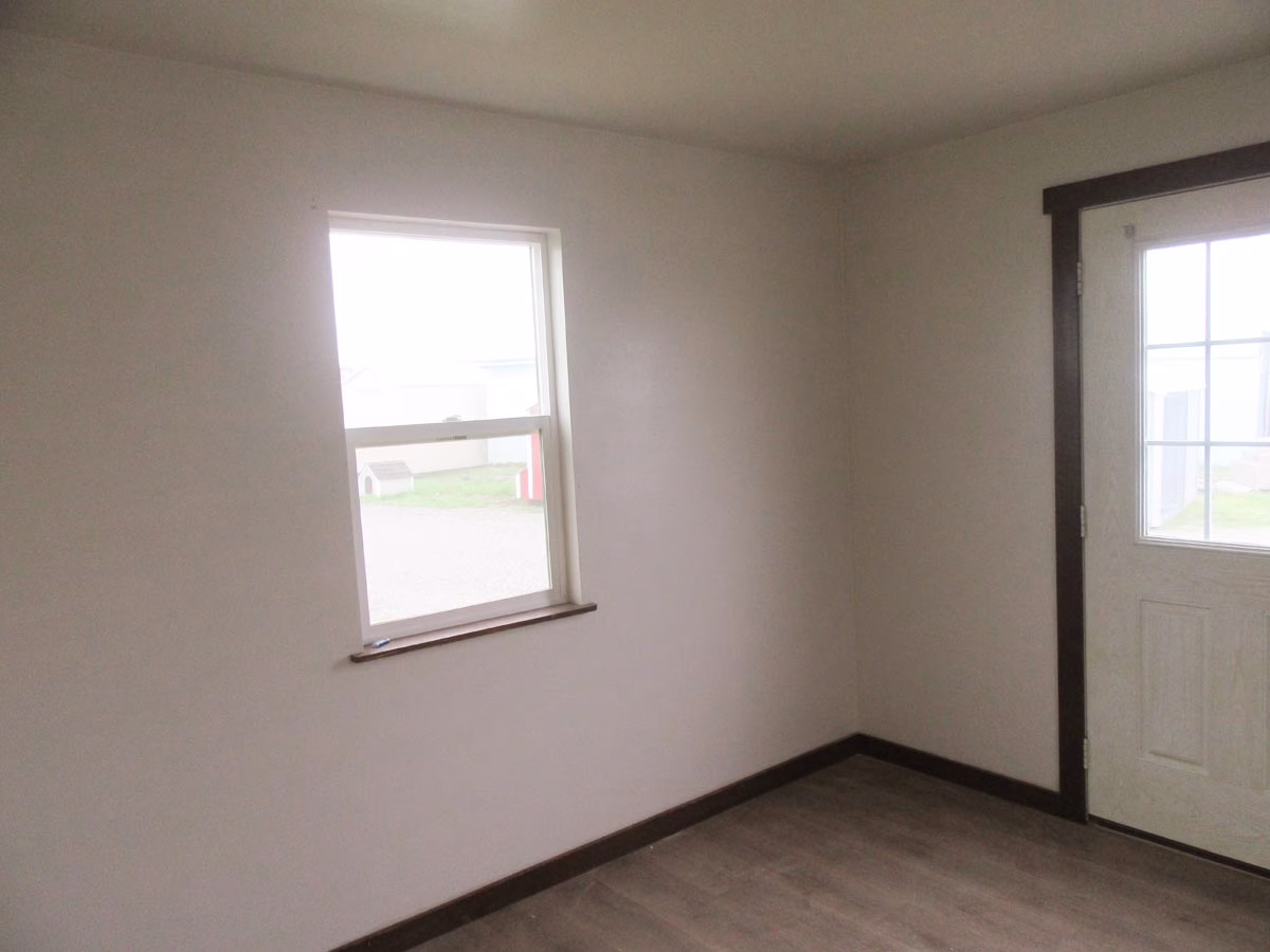 The exterior is primed and painted, and has a 40-year metal roof. The walls, ceiling, and floor are all insulated. The door is a standard entry door with a 9-lite window.