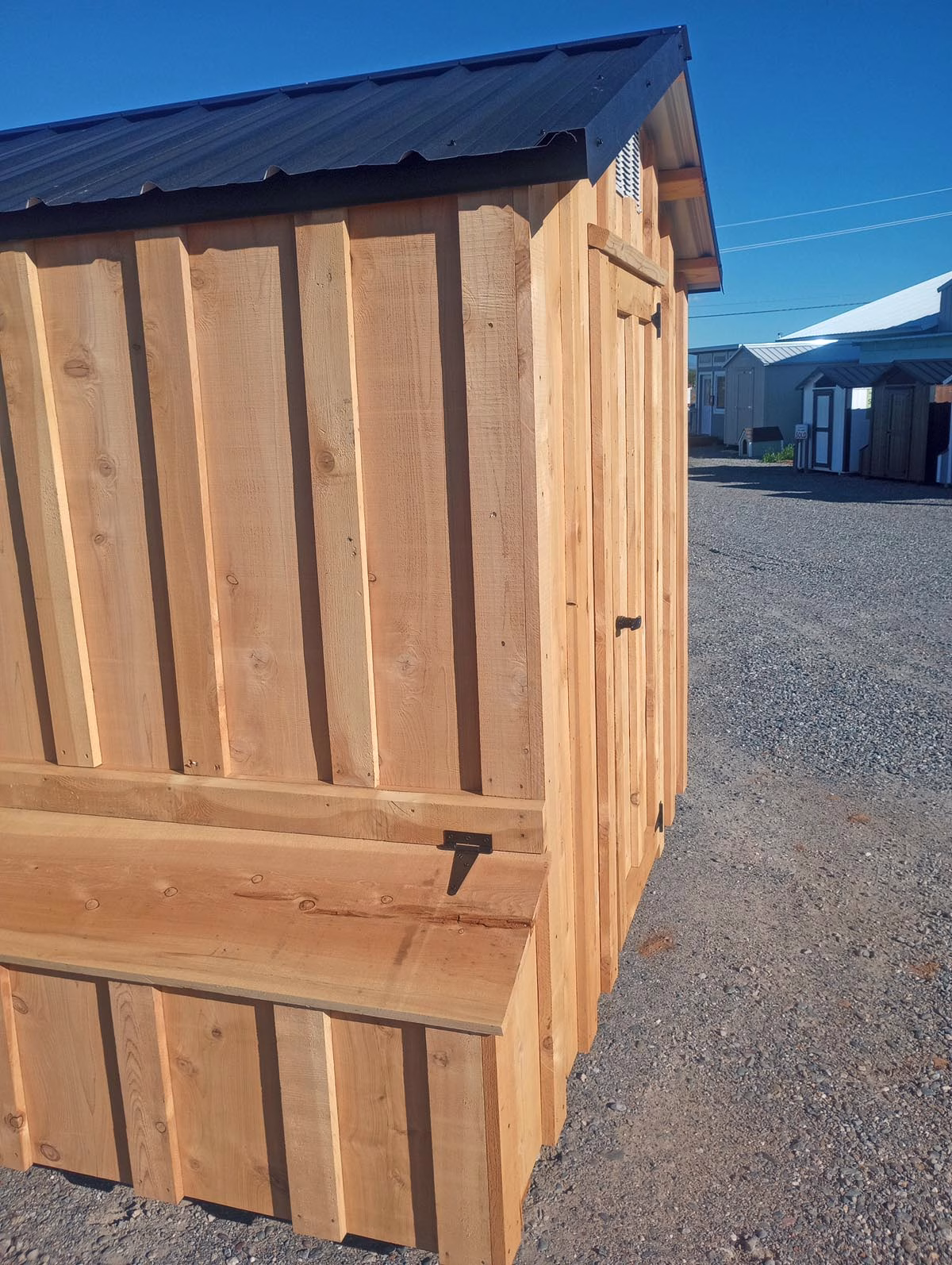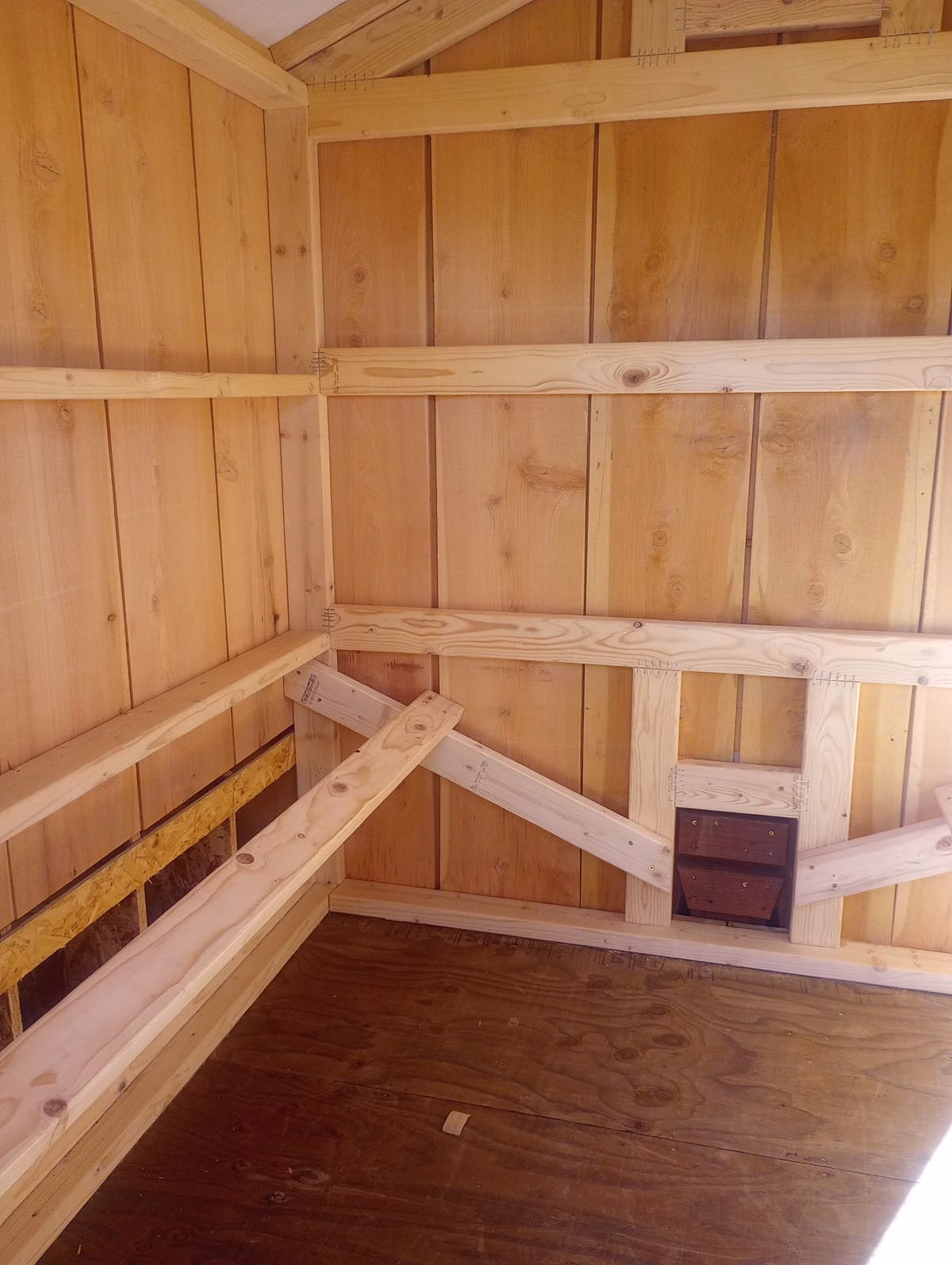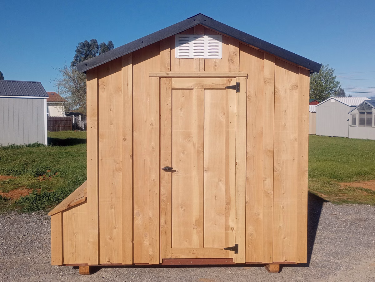 Now hereā¦chicken coops for sale at Sequoia Sheds! This is a unique, one-of-a-kind coop. It is covered in rough-sawn cedar -real, genuine cedar boards. The inside has that rich cedar smell.